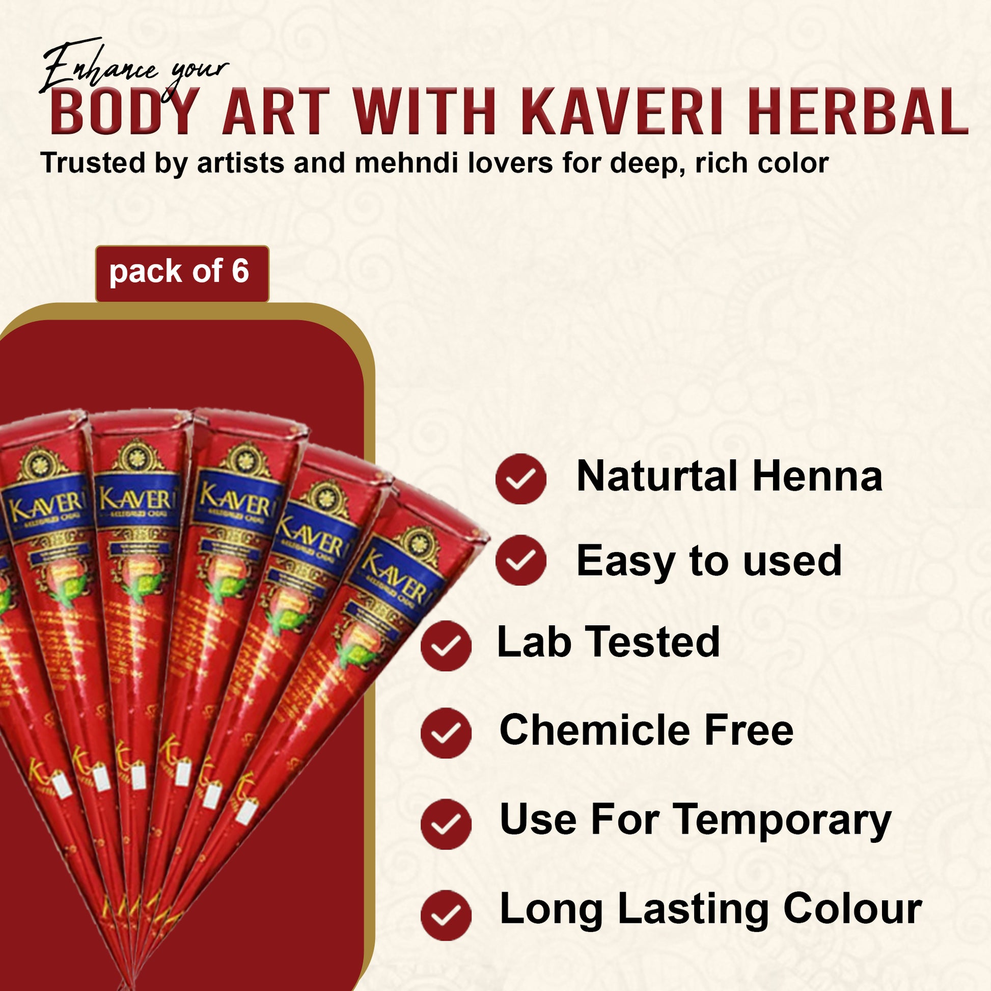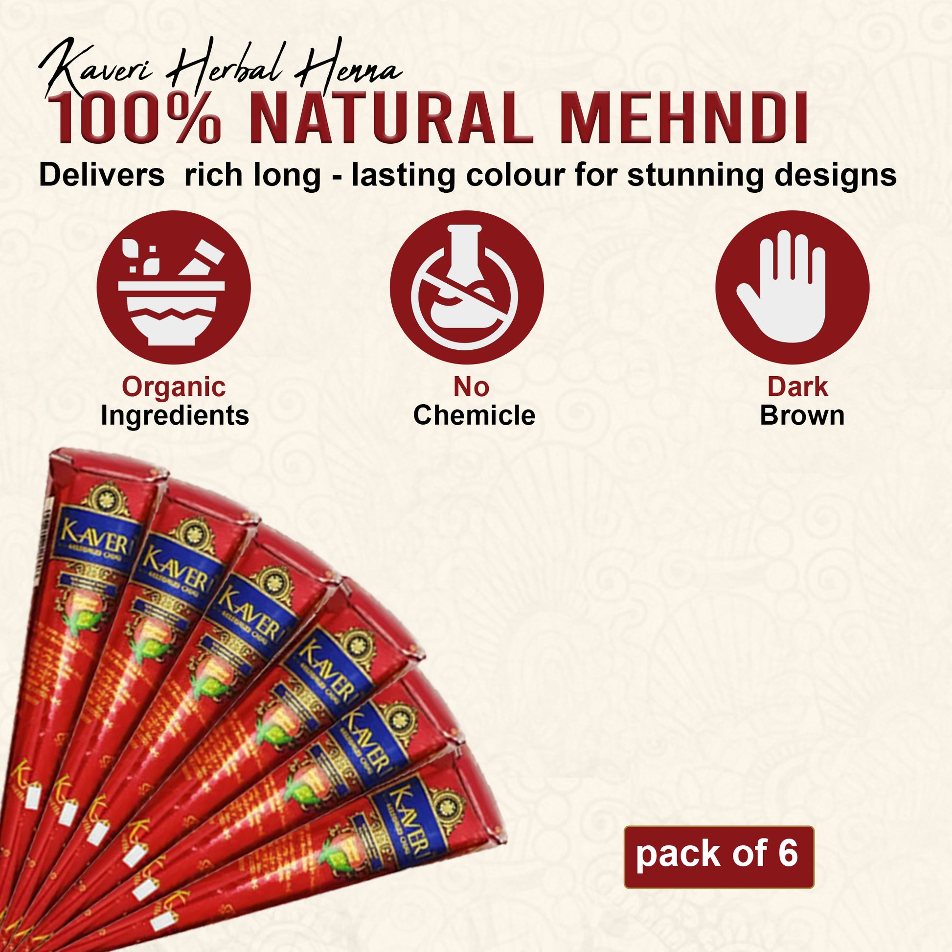 Kaveri Herbal Henna Cones – Set of 6 | 100% Natural Mehndi for Hands & Body Art